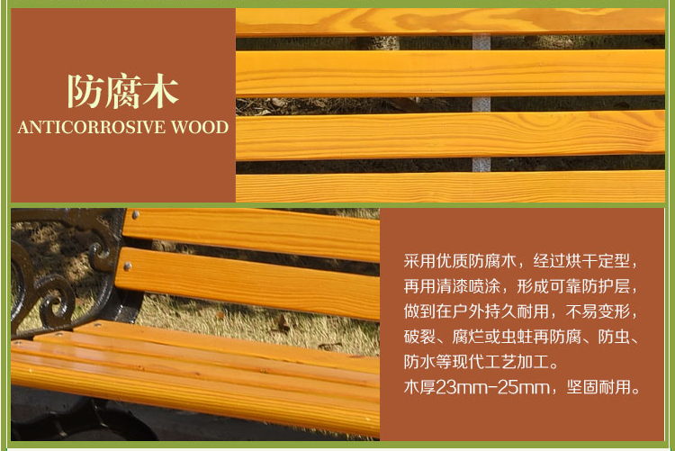 1.材質:天然實木+高強度鑄鐵骨架+高檔油漆噴涂,堅固、持久耐用不變形、防水、防腐、防蟲。2.做工:先進工藝技術,線條均勻平整,出口歐美標準,每個細節都處理極致完美。