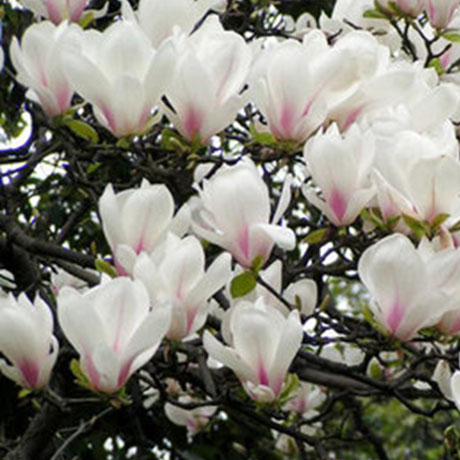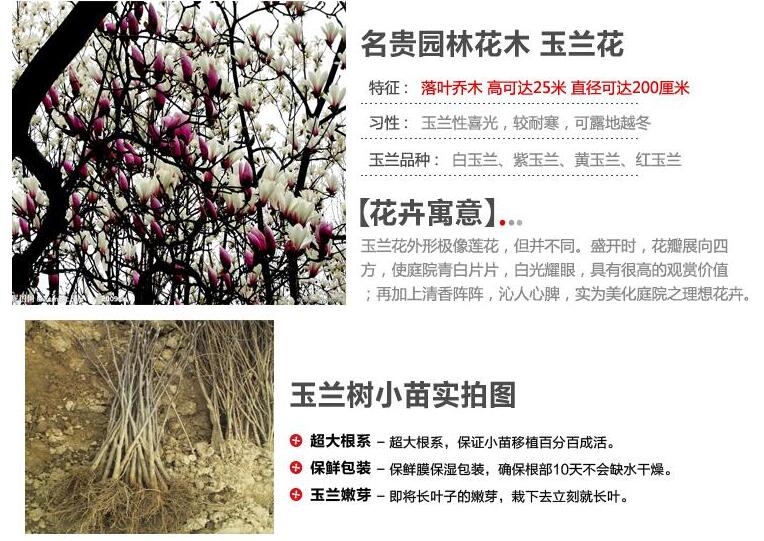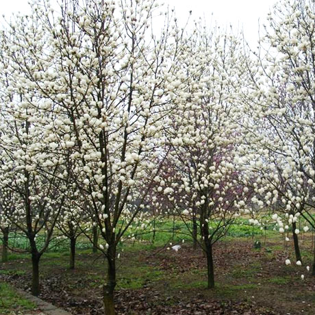 又名木蘭、白玉蘭、玉蘭等。木蘭科落葉喬木,樹高一般2—5米或高可達15米。花白色,大型、芳香,先葉開放,花期10天左右。中國著名的花木,北方早春重要的觀花樹木。上海市市花。中國有2500年左右的栽培歷史,為庭園中名貴的觀賞樹。分布于中國中部及西南地區,現世界各地均已引種栽培。通常用播種、嫁接法繁殖。喜溫暖、向陽、濕潤而排水良好的地方,要求土壤肥沃、不積水。有較強的耐寒能力,在-20℃的條件下可安全越冬。在北京小環境較好的地方生長良好。移栽應在萌動前十余日,或花后展葉前進行。播種苗,一般要5年左右方能開花。北方常見的還有二喬玉蘭,花瓣外面淡紫色里面白色。