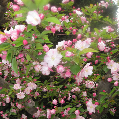 ? ? ? ?西府海棠在海棠花類中樹態(tài)峭立,似亭亭少女?;t,葉綠,果美,不論孤植、列植、叢植均極美觀。最宜植于水濱及小庭一隅。郭稹海棠詩(shī)中“朱欄明媚照黃塘,芳樹交加枕短墻?!本褪亲钌鷦?dòng)形象的寫照。新式庭園中,以濃綠針葉樹為背景,植海棠于前列,則其色彩尤覺奪目,若列植為花籬,鮮花怒放,蔚為壯觀。