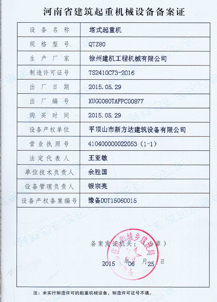 ? ? ? ?平頂山市新方達建筑設備有限公司主要業務包括:各種型號塔吊、施工升降機、物料提升機、小型建筑機械的銷售、租賃、安拆、養護維修、土建工程施工、物流運輸、園林花卉、企業咨詢、企業策劃、廣告制作發布、新型全鋼液壓成型標準扣件(本公司專利產品)的設計、研發、生產、銷售,各種土建工程的勞務承包、勞務輸出、農牧業開發、生態園開發建設等業務。