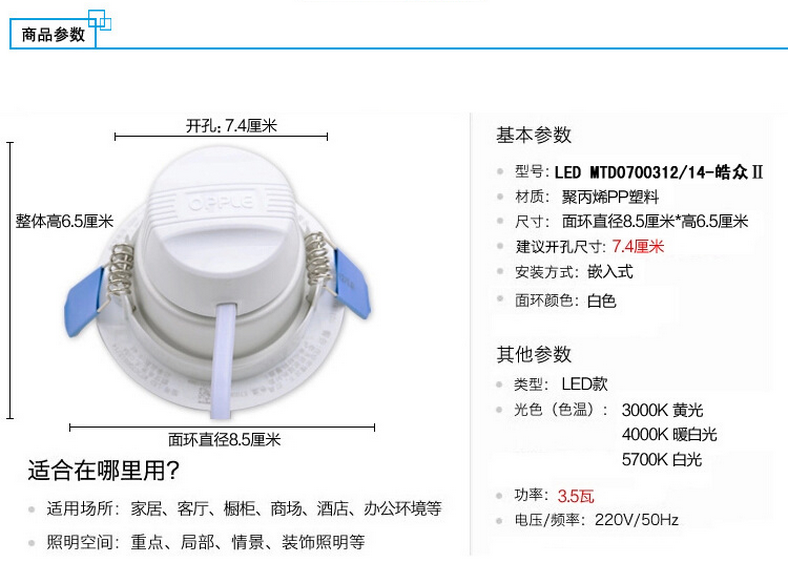 | 品牌 | OPPLE/歐普照明 | 型號(hào) | LED MTD0700312/14-皓眾Ⅱ-3.5W-3000K-平面 | 輸入電壓 | 220(V) |