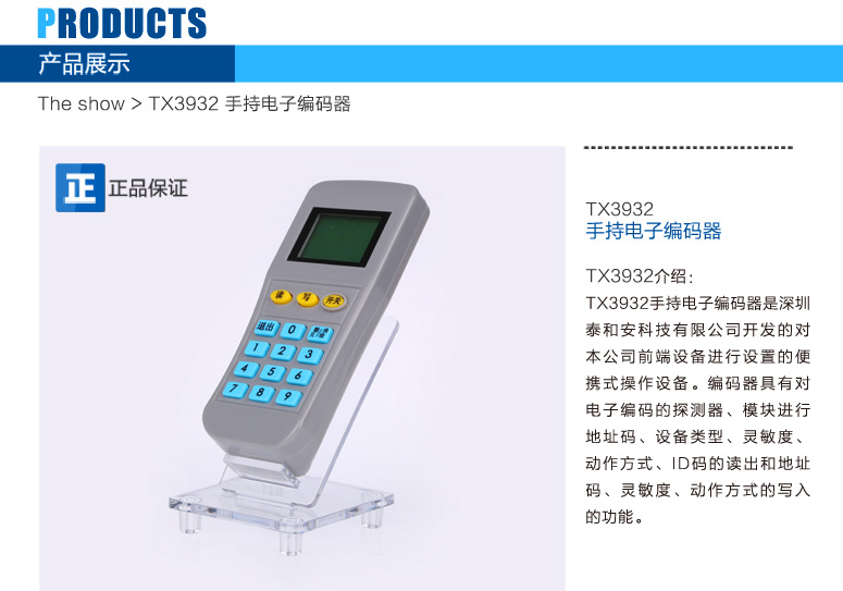 ? ? ? ??TX3932手持電子編碼器(以下簡稱編碼器)是深圳泰和安科技有限公司開發的對本公司前端設備進行設置的便攜式操作設備。編碼器具有對電子編碼的探測器、模塊進行地址碼、設備類型、靈敏度、動作方式、ID碼的讀出和地址碼、靈敏度、動作方式的寫入的功能。?