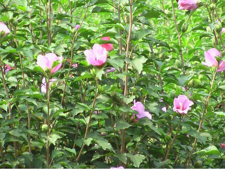 木槿(Hibiscus syriacus),系錦葵科木槿屬落葉花灌木或小灌木,株高3~5米。小枝幼時(shí)密被絨毛,后漸脫落,老枝具白色皮孔。葉片呈三角形或菱狀,長(zhǎng)3~6厘米,基部楔形,端部常3裂,邊緣有鈍齒,嫩葉表面有星狀毛。花著生于當(dāng)年生枝條,單生葉腋,花冠直徑5~8厘米,呈喇叭狀或風(fēng)車狀,單瓣,半重瓣或重瓣,花色有淡紫、紫紅、深紫紅、粉紅、紅、白等,有些品種花瓣基部呈紅色或紫紅色。花期6~10月。
