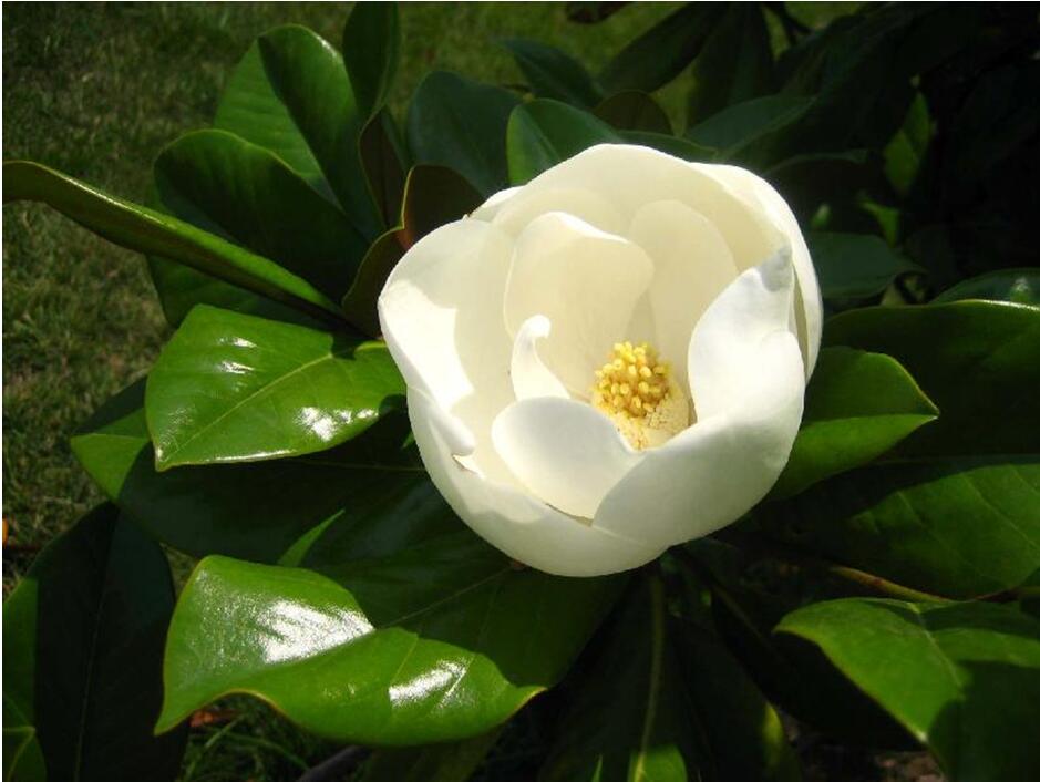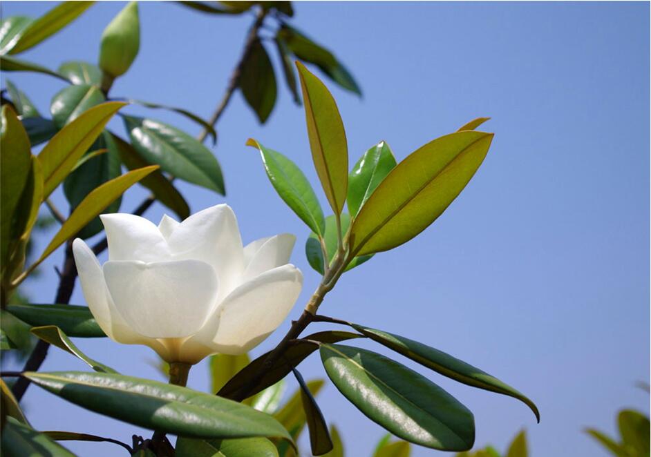 廣玉蘭樹姿優雅,四季常青,病蟲害少,因而是優良的行道樹種,不僅可以在夏日為行人提供必要的庇蔭,還能很好地美化街景。但栽種時應盡量選擇較大一些的苗木,干徑3~6 cm,高度2. 8 m 左右較為適宜。過小,則易遭破壞;過大,則移栽成活率低。道路綠化時,廣玉蘭與色葉樹種配植,能產生顯著的色相對比,從而使街景的色彩更顯鮮艷和豐富。在綠化帶應用中,將廣玉蘭與紅葉李間植,并配以桂花、海桐球等,不僅在空間上有層次感,而且色相上又有很大的變化,打破了序列空間的單調,產生一種和諧的韻律感,取得了很好的效果 。