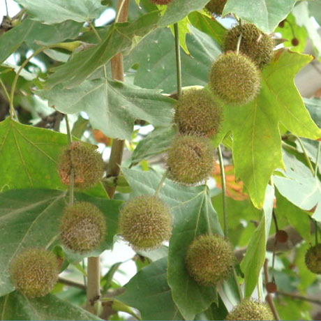 落葉大喬木,高達30米,樹皮薄片狀脫落;嫩枝被黃褐色絨毛,老枝禿凈,干后紅褐色,有細小皮孔。葉大,輪廓闊卵形,寬9-18厘米,長8-16厘米,基部淺三角狀心形,或近于平截,上部掌狀5-7裂,稀為3裂,中央裂片深裂過半,長7-9厘米,寬4-6厘米,兩側裂片稍短,邊緣有少數裂片狀粗齒,上下兩面初時被灰黃色毛被,以后脫落,僅在背脈上有毛,掌狀脈5條或3條,從基部發出;葉柄長3-8厘米,圓柱形,被絨毛,基部膨大;托葉小,短于1厘米,基部鞘狀。花4數;雄性球狀花序無柄,基部有長絨毛,萼片短小,雄蕊遠比花瓣為長,花絲極短,花藥伸長,頂端盾片稍擴大;雌性球狀花序常有柄,萼片被毛,花瓣倒披針形,心皮4個,花柱伸長,先端卷曲。