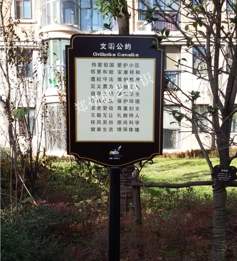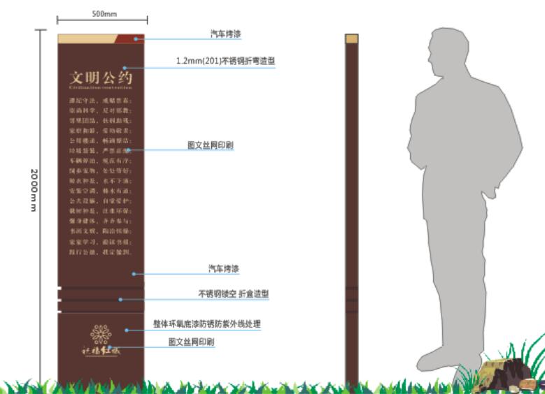 ? ? 文明公約一般都用常用廣告材料,有亞克力、PVC、鋁型材、雙色板等等。亞克力采用后面絲印烤漆的工藝,也可以背面雕刻填漆,然后再烤漆。PVC板材在雕刻后,烤漆絲印,有些有要求的需要在表面上再噴一層清漆,能夠保護絲印的內容不受磨損。鋁型材,可以在表面絲印,罩清漆,也可以粘貼即時貼或反光膜。雙色板是最便宜的材料,直接雕刻就可以了。