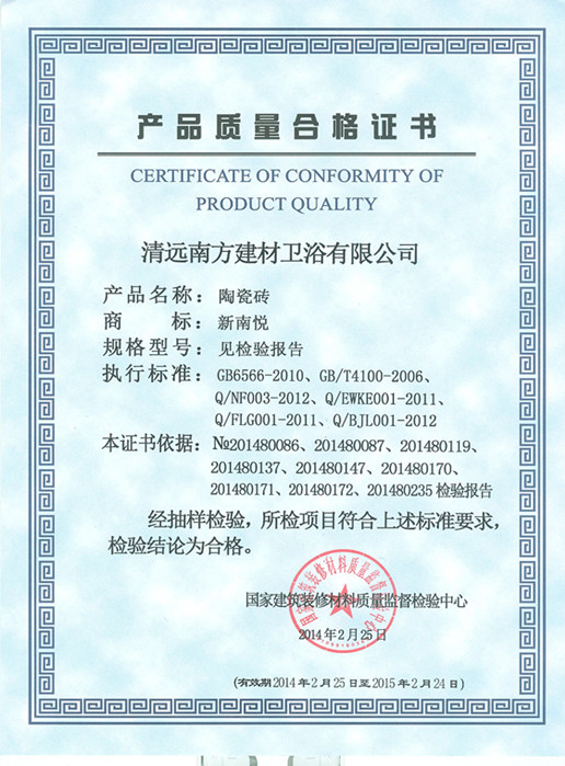 新南悅陶瓷以科技創新和產品創新享譽業界,以“為消費者營造空間之美和生活之悅”為己任,全面通過ISO9001:2008國際質量管理體系認證、國家強制性3C認證、中國環保產品認證,先后榮獲廣東省名牌產品、中國陶瓷行業名牌、中國馳名商標等多項殊榮。