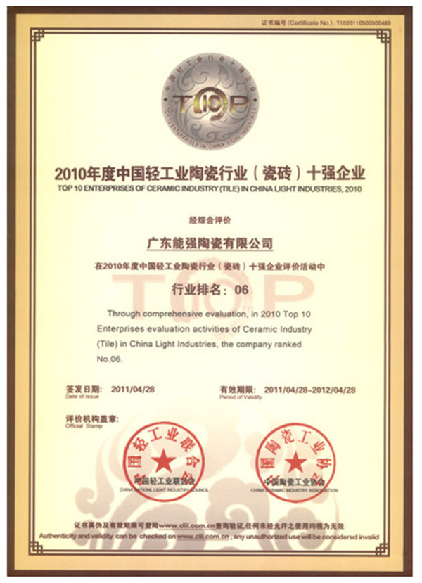 公司聚集了過百名的研發精英以及管理人才,無論產品的品種開發,品質監控和營銷策略,都走在同行的前列。我們積極開展與國內外著名研究所的技術交流合作,不斷推出創新市場的產品,多項產品通過省級新產品鑒定。能強陶瓷先后獲得“ISO9001:2008質量管理體系認證”、 “國家3C強制性認證”、“ISO14001:2004環境管理體系認證”、 “中國陶瓷行業名牌產品”、 “建材環保產品認證”、 “廣東省名牌產品”、 “中國馳名商標”、“廣東省著名商標” 、“中國家居行業十大影響力品牌”、 “中國陶瓷行業十大綠色品牌”、 “2013陶瓷十大品牌”等多個國家級榮譽稱號。