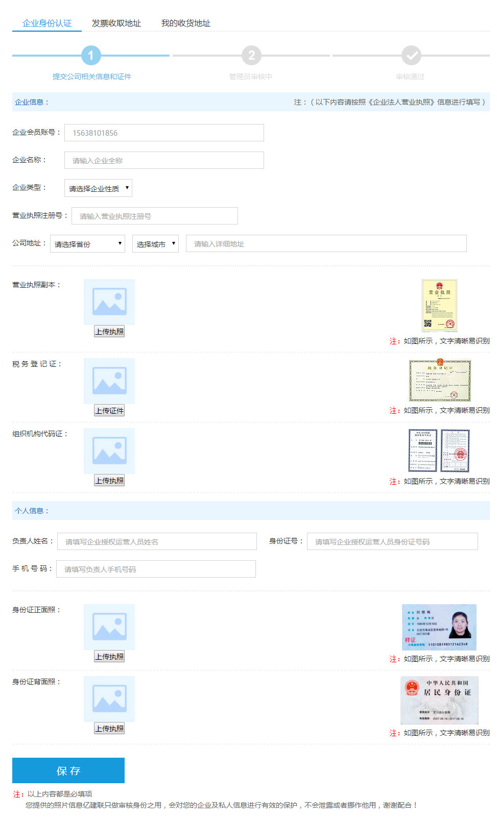 2)為了保證企業在億建聯平臺的真實性和合法性,凡是進入億建聯平臺的企業都要通過企業身份認證,只有通過了企業身份認證才可以下單采購所需貨品。為了不給企業在采購時造成不必要的麻煩,請及時完成認證。如下圖為企業信息認證表單,每一項都是必填項,請認真填寫,謝謝合作。